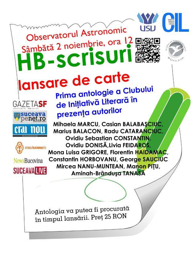 Clubul de iniţiativă literară lansează mâine, 1 noiembrie 2013, prima sa antologie, o antologie coordonată de Mihaela Marcu. Dacă se întâmplă să fiţi sâmbătă prin Suceava, sunteţi invitaţi de la orele 12 la Observatorul Astronomic, locul unde va avea loc lansarea.